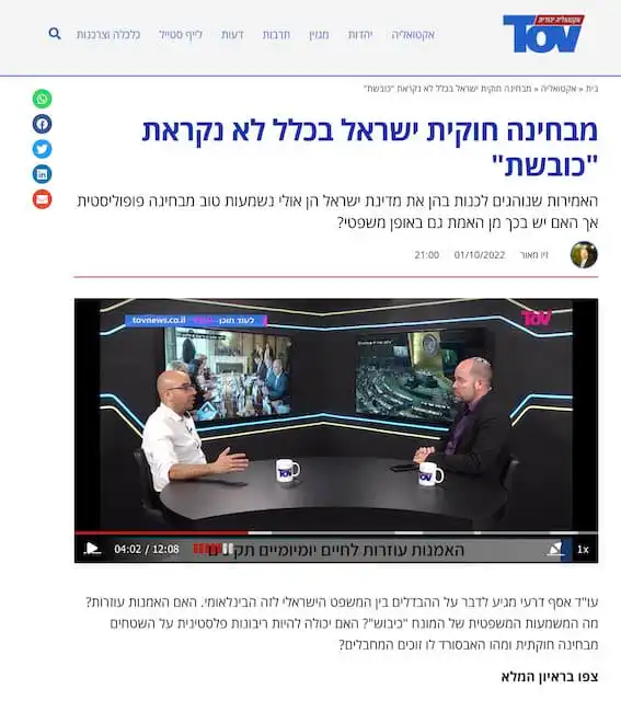 We are aware that a significant part of the world sees Israel as an occupying state, however, is such a claim accurate? The Aktualia TOV (TOV ‘current affairs’) website invited attorney Assaf Derri to talk and explain the legal definitions of the term “occupation” and whether this could be applied to Israel? He went on to discuss the disputes, the absurdity of the terrorists, and the differences between Israeli and international law. Watch: